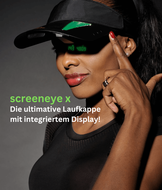 Die ultimative Laufkappe mit integriertem Display!Trainingsdaten-Anzeige: Verbinde die Screeneye X mit einem Laufsensor und/ oder einem Herzfrequenzmesser um dir über das integrierte Display verschiedene Trainingsdaten wie Geschwindigkeit, Distanz, Zeit, Herzfrequenz und Schrittfrequenz in Echtzeit anzeigen zu lassen. Dies ermöglicht es dir, deine Leistung während des Laufens zu überwachen. ANT+ Konnektivität: Unsere Laufkappe ist mit der neuesten ANT+ Technologie ausgestattet, um Ihre Trainingsdaten präzise und zuverlässig zu übertragen. Li-Ion-Akku: Machen Sie sich keine Sorgen um den Stromverbrauch! Unser integrierter Li-Ion-Akku bietet beeindruckende 30 Stunden Akkulaufzeit mit einer einzigen Ladung. Das bedeutet, dass Sie stundenlang laufen können, ohne sich Gedanken über das Aufladen machen zu müssen. Und wenn es Zeit zum Aufladen ist, verwenden Sie einfach das mitgelieferte Micro-USB-Kabel - schnell, einfach und bequem! Display mit Lichtsammlerfolie: Die Beleuchtung unseres Displays erfolgt über eine innovative Lichtsammlerfolie, die dafür sorgt, dass Sie Ihre Daten auch bei schlechten Lichtverhältnissen deutlich sehen können. Regen oder Sonnenschein, Tag oder Nacht - Ihre Trainingsinformationen sind immer gut sichtbar! Funktionen, die Ihr Training verbessern: Überwachen Sie Geschwindigkeit, Distanz, Zeit, Herzfrequenz, Schrittfrequenz und mehr in Echtzeit. Das ist die neue Art zu trainierenMit der Weltneuheit data4vision: Screeneye x Sports Visor mit Digitaler (ANT+) Laufsensor. Präsentiert o-synce eines der innovativsten Trainingssysteme auf dem Markt. Die gesamte Sportelektronik ist im Schirm der Kappe integriert und stellt alle Daten jederzeit sichtbar auf dem integrierten Heads-Up-Display dar. Und der max run ist das ideale Tool für eine umfassende Analyse und Steuerung des Lauftrainings. Wenn du den Lauf-Geschwindigkeitssensor einmal mit screeneye gekoppelt hast, die ANT+ Daten verarbeiten kann, gibt er künftig Auskunft über Laufgeschwindigkeit, zurückgelegte Strecke, Durchschnittsgeschwindigkeit sowie Schrittzahl. Läufer und für viele Ausdauersportler ergeben sich bisher unerreichbare Trainingsmöglichkeiten. Ohne Kalibrierung (die der Nutzer auf einer definierten Strecke, z.B. einer 400 m Bahn, vornehmen kann) liegt die Genauigkeit des Sensors bei 95%. Mit Kalibrierung steigt sie auf 97 bis 98%. -Die Übertragung zur screeneye erfolgt bei 2,4 GHz mit ANT+Sport-Protokoll. -Das Gewicht des Sensors beträgt 27 Gramm mit Batterie.-Die Reichweite beträgt bis zu 3 Metern.